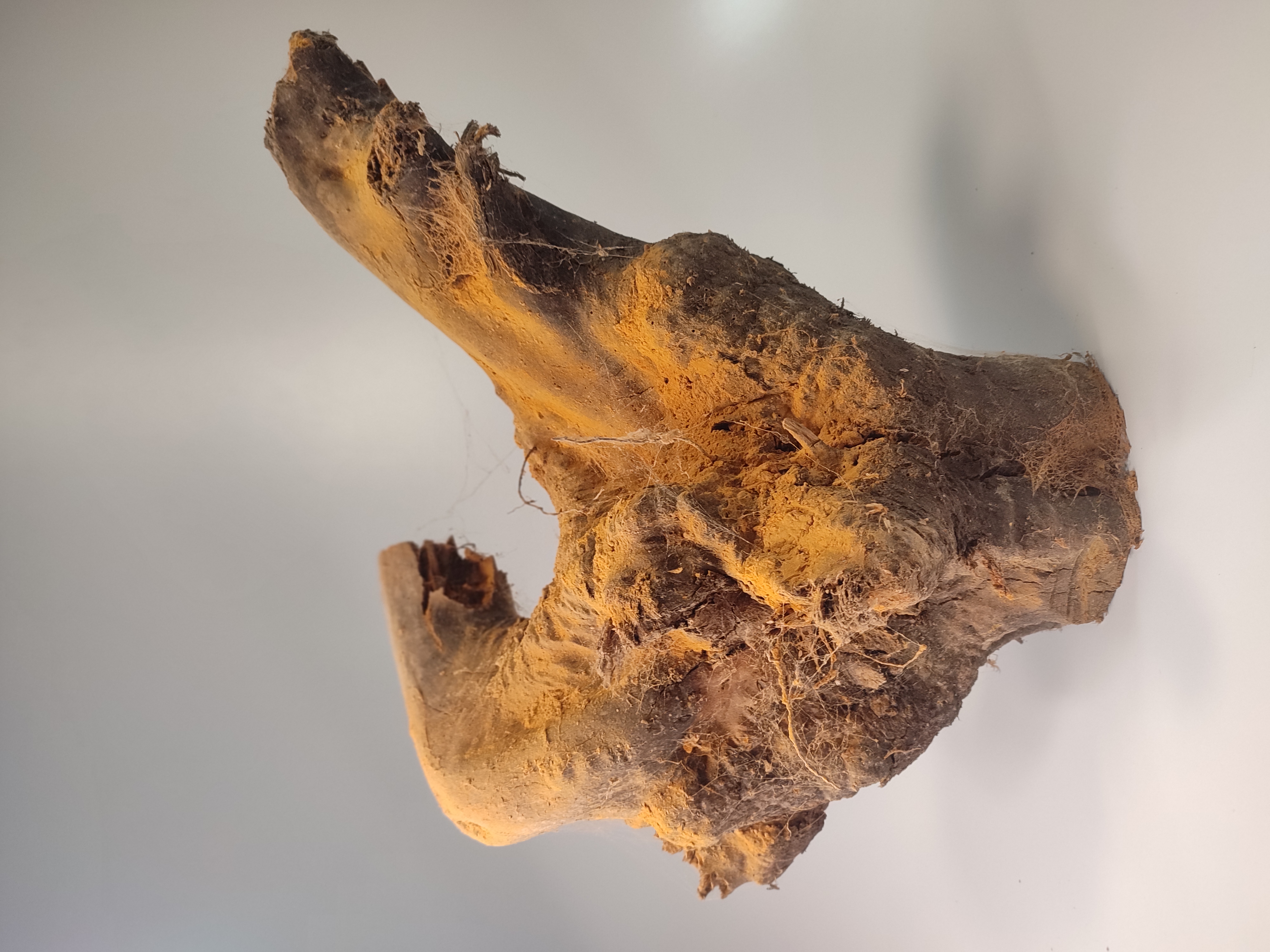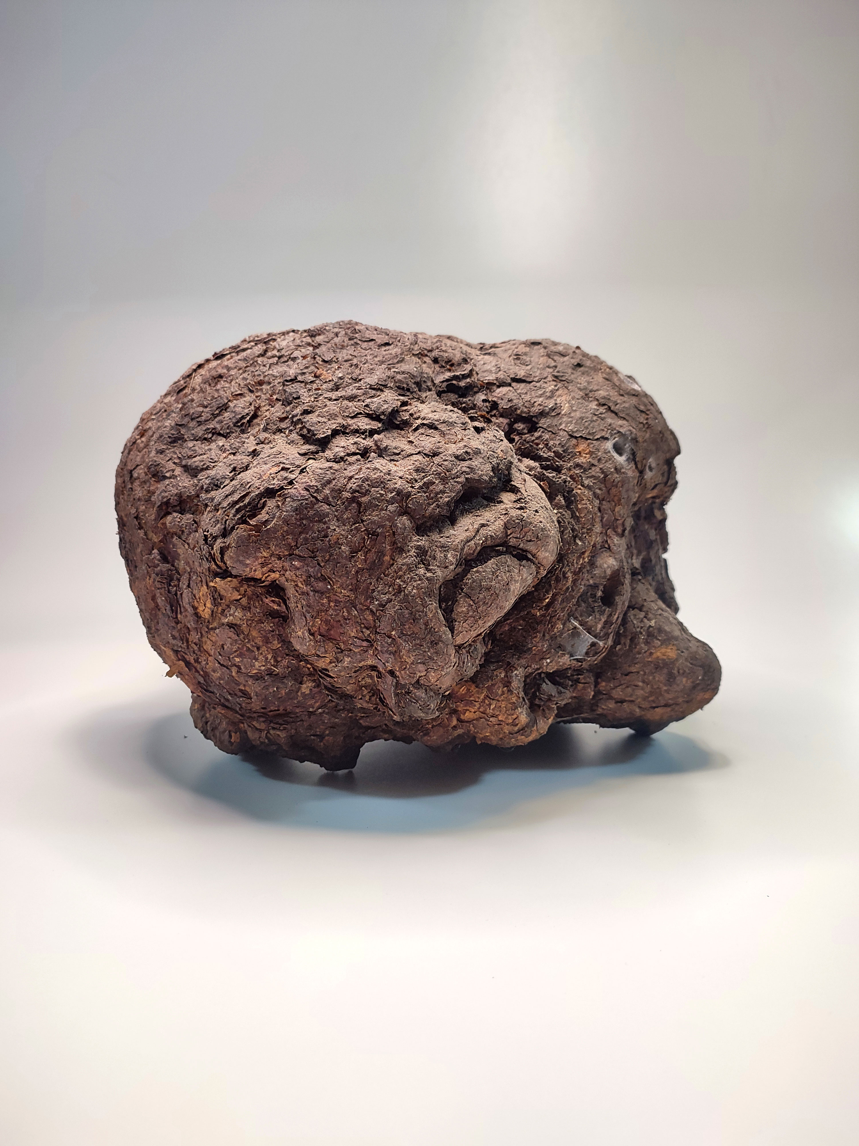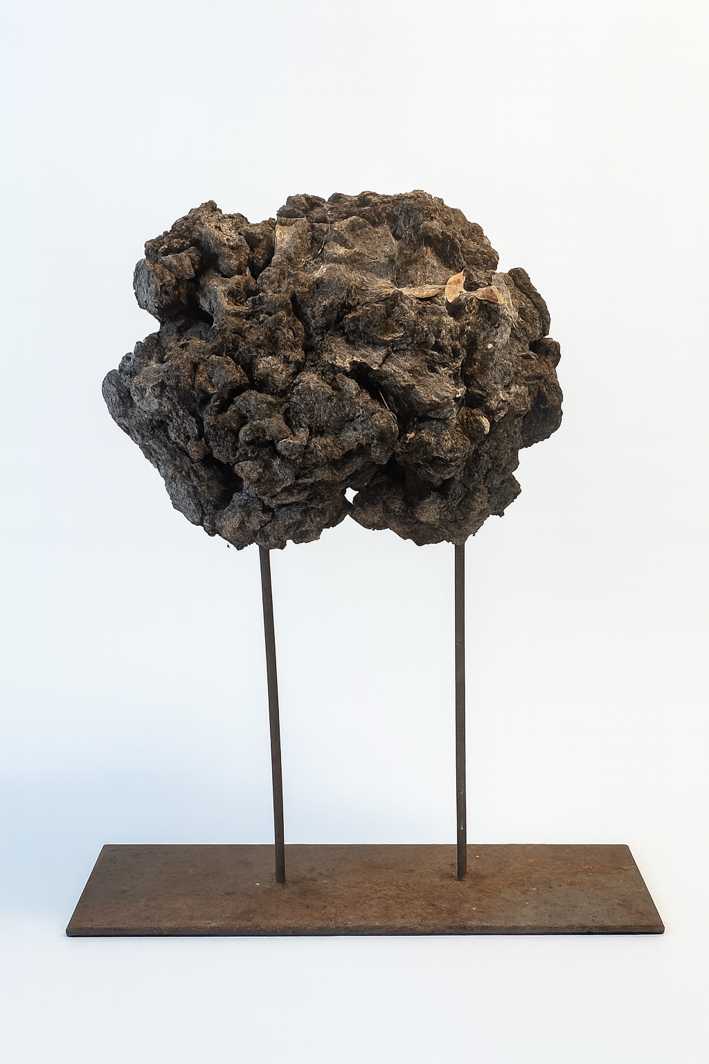 Masa oscura y rugosa, de superficie quebrada y compacta. La pieza se alza sobre dos varillas metálicas, como suspendida en el aire. La textura recuerda un tejido petrificado, endurecido por el tiempo, con pliegues y cavidades que evocan materia cerebral. El volumen transmite densidad, concentración, una fuerza vital contenida en su interior, como si el árbol hubiera comprimido su memoria en un único fragmento.